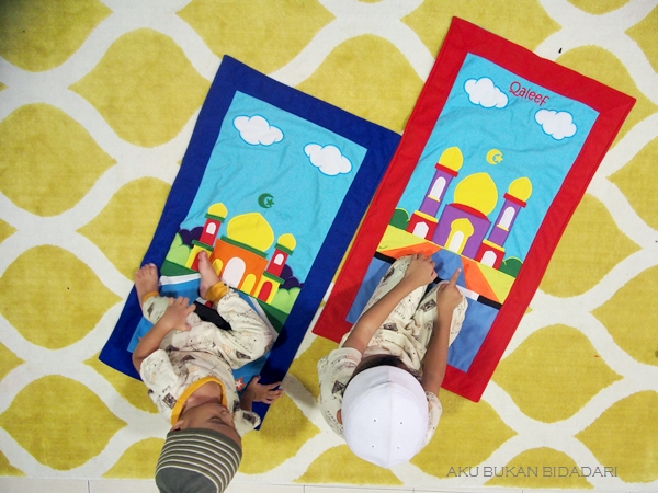 sebab tu.. nak beli sejadah pon.. kene beli sorang satu..!! saja aku beli yang comel2 macam ni tuk bagi derang rasa lebih eksaited nak bersolat..sementara masih kecik ni kan.. sebagai SALAH SATU GALAKKAN tuk anak tu sendiri.. ada sejadah masing2 sendiri.. lagi2 tempah ada nama dah sesiap.. memang boleh nampak pon kesan lebih baik.. sebab derang seronok pakai sejadah tu setiap kali pon.. jadi bila masuk jer waktu dengar azan laju2 nak solat sebab agak nya seronok nak tengok pakai sejadah comel ni..